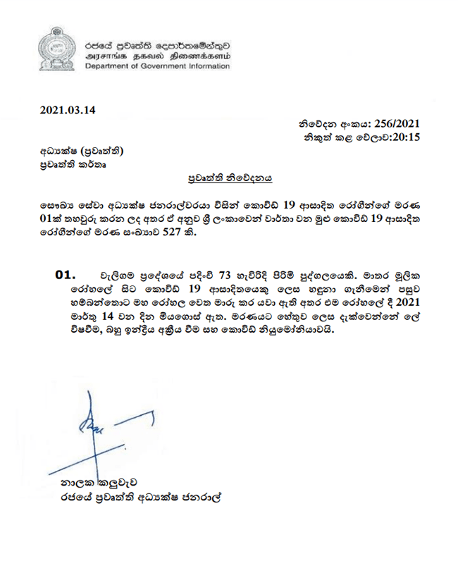 ඒ අනුව මෙරට සමස්ත කොවිඩ් -19 මරණ සංඛ්යාව 527 දක්වා ඉහල ගොස් ඇත.