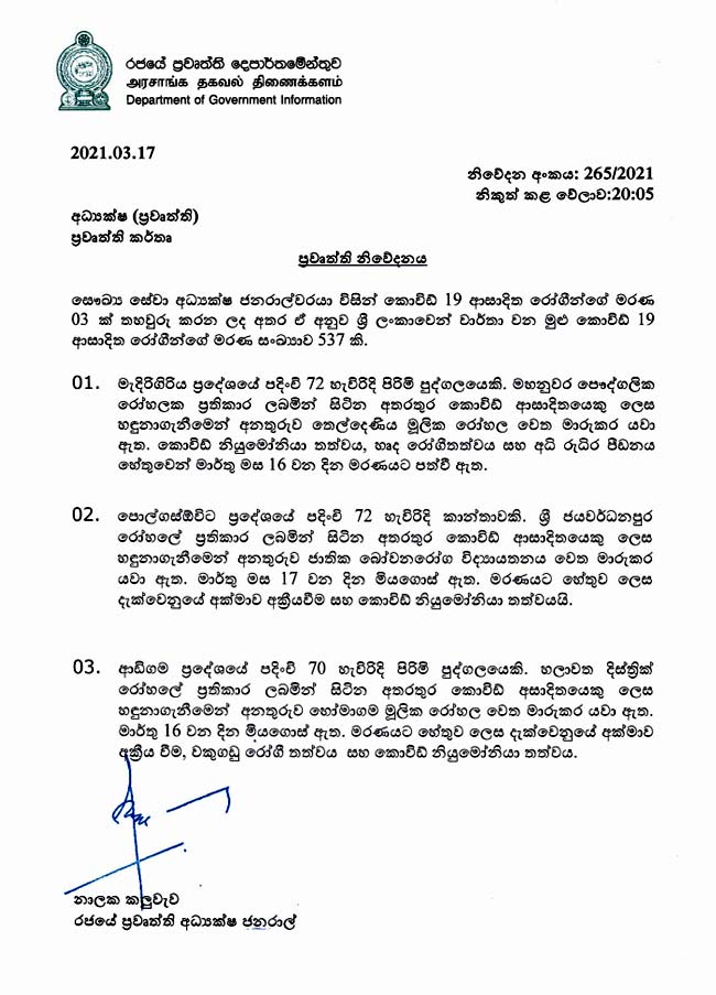 දැනට ශ්රී ලංකාව තුළ කොවිඩ්-19 නිසා සිදු වී ඇති මරණ සංඛ්යාව – 537
