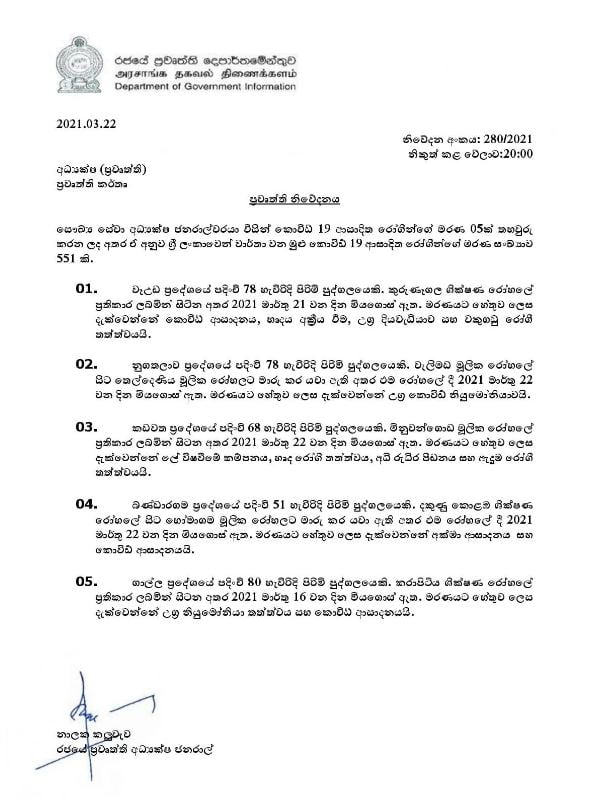 පසුගිය පැය 24 තුළ ශ්රී ලංකාව තුළින් කොවිඩ්-19 ආසාදිත වීමෙන් පුද්ගල මරණයක් වාර්තා වී ඇති අතර මෙලෙස මිටගොස් ඇත්තේ, වෑඋඩ ප්රදේශයේ පදිංචි 78 හැවිරිදි පිරිමි පුද්ගලයෙක්, නුගතලාව ප්රදේශයේ පදිංචිව සිටි 78 හැවිරිදි පිරිමි පුද්ගලයෙක්, කඩවත ප්රදේශයේ පදිංචිව සිටි 68 හැවිරිදි පිරිමි පුද්ගලයෙක්, බණ්ඩාරගම ප්රදේශයේ පදිංචිව සිටි 51 හැවිරිදි පිරිමි පුද්ගලයෙක් සහ ගාල්ල ප්රදේශයේ පදිංචිව සිටි 80 හැවිරිදි පිරිමි පුද්ගලයෙක් වේ. ඒ අනුව මෙරට සමස්ත කොවිඩ් -19 මරණ සංඛ්යාව 551 දක්වා ඉහල ගොස් ඇත.