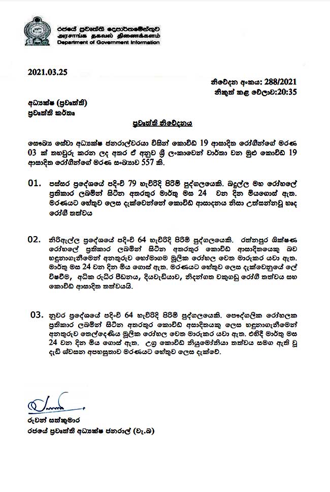 පසුගිය පැය 24 තුළ ශ්‍රී ලංකාව තුළින් ‍කොවිඩ්-19 ආසාදිත වීමෙන් පුද්ගල මරණ 03 ක් වාර්තා වී ඇති අතර මෙලෙස මිටගොස් ඇත්තේ,  පස්සර ප්‍රදේශයේ පදිංචිව සිටි 79 හැවිරිදි පිරිමි පුද්ගලයෙක්, නිරිඇල්ල ප්‍රදේශයේ පදිංචිව සිටි 64 හැවිරිදි පිරිමි පුද්ගලයෙක් සහ නුවර ප්‍රදේශයේ පදිංචිව සිටි 64 හැවිරිදි පිරිමි පුද්ගලයෙක් වේ. ඒ අනුව මෙරට සමස්ත කොවිඩ් -19 මරණ සංඛ්‍යාව 557 දක්වා ඉහල ගොස් ඇත.