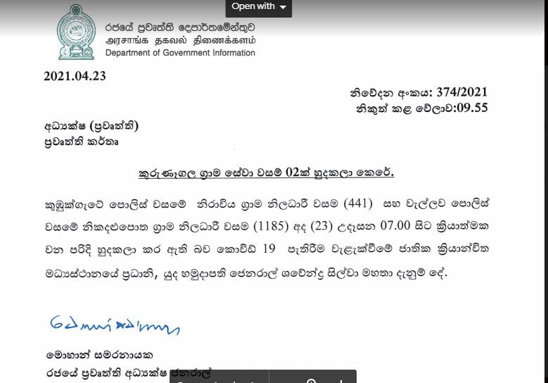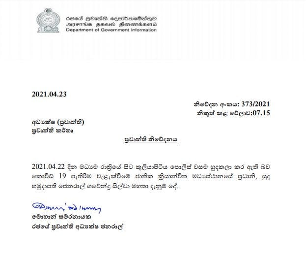 අද (23) දින කුරුණෑගල දිස්ත්රික්කයේ වාරියපොළ, කුඹුක්ගැටේ පොලිස් බල ප්රදේශයේ නිරාවිය ග්රාමසේවා වසම සහ වැල්ලව පොලිස් බල ප්රදේශයේ නිකදළුපොත ග්රාමසේවා වසම් දෙක හුදකළා කළ බව කොවිඩ් -19 පැතිරීම වැළැක්වීමේ ජාතික ක්රියාන්විත මධ්යස්ථානයේ ප්රධානී යුද හමුදාපති ජෙනරල් ශවේන්ද්ර සිල්වා මහතා නිවේදයක් නිකුත් කරමින් ප්රකාශ කළේය.