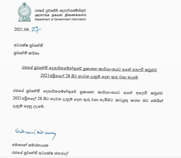 GossipsHot Newsරජයේ ප්රවෘත්ති දෙපාර්තමේන්තුවේ ප්රකාශන කාර්යංශ අලෙවි කවුළුව හෙට සිට වසා දැමේ.. sp5 years ago5 years ago01 mins රජයේ ප්රවෘත්ති දෙපාර්තමේන්තුවේ ප්රකාශන කාර්යාංශයට අයත් අලෙවි කවුළුව අප්රේල් 28 දින එනම් හෙට දින සිට නැවත දැනුම් දෙන තුරු වසා තැබීමට තීරණය කර තිබේ.News.lkShare this:TwitterFacebookWhatsAppLike this:Like Loading...Post navigationPrevious: ලබන 30 වනදා තෙක් දිවයිනේ සියලුම පාසල් ලබන වසා තැබේ..Next: චීන ආරක්ෂක ඇමති අද රාත්රියේ දිවයිනට..Leave a Reply Cancel replyYour email address will not be published. Required fields are marked *Comment *Name * Email * Website Save my name, email, and website in this browser for the next time I comment. Δ