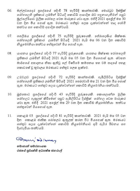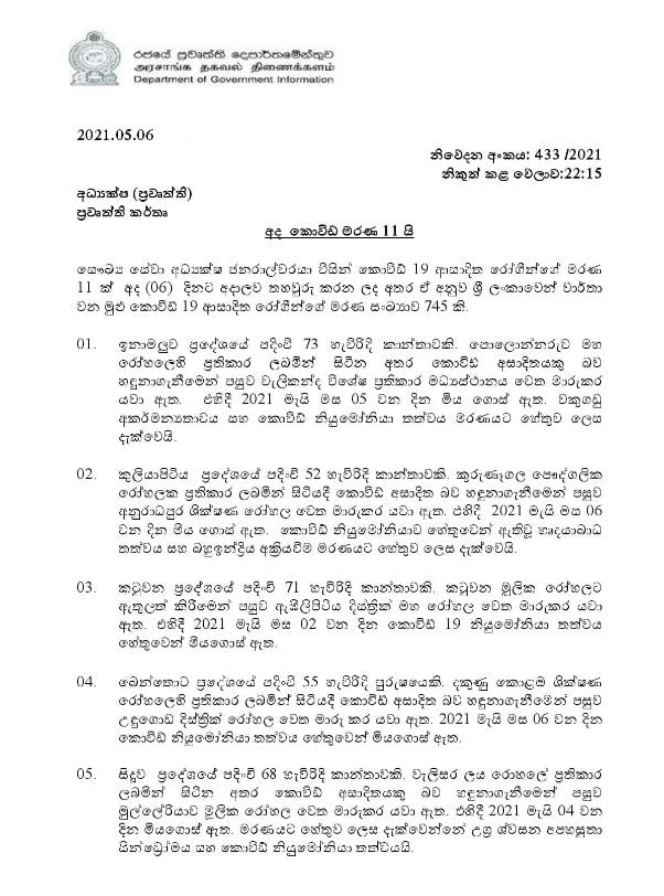 කෙසේ වෙතත් පසුගිය පැය 24 තුළ ශ්රී ලංකාව තුළින් කොවිඩ්-19 ආසාදිත වීමෙන් පුද්ගල මරණ 11 ක් වාර්තා වී ඇති අතර මෙලෙස මියගොස් ඇත්තේ, උඩවලව, බුලුතොට, මල්ලවගෙදර , කටුවාන, සීදුව, ඉනාමළුව, යාපනය, කොළඹ 3 , කුලියාපිටිය, බෙන්තොට සහ ගෙලිඔය යන ප්රදේශ වල පුද්ගලයින් වේ . ඒ අනුව මෙරට සමස්ත කොවිඩ් -19 මරණ සංඛ්යාව 745 ක් දක්වා ඉහළ ගියේ ය.