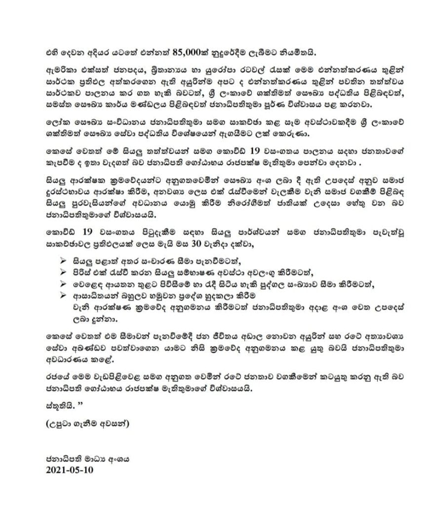 එම නිවේදනයේ වැඩිදුරටත් දැක්වෙන්නේ, අදාළ සීමා පැනවීමේ දී ජනජීවිතය අඩාල නොවීමට වගබලා ගැනීම සඳහා නිසි වැඩපිළිවෙළක් ක්රියාත්මක කරන මෙන් ජනාධිපතිතුමා උපදෙස් දී ඇති බව ය.