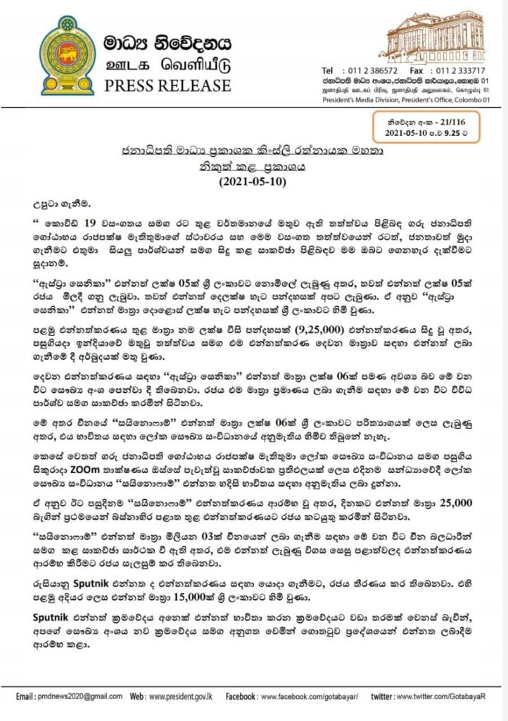 මේ අතර කොවිඩ් ව්යාප්ත වීමත් සමගම වර්තමානයේ ඇති තත්ත්වය සම්බන්ධයෙන් ජනාධිපති මාධ්ය අංශය මගින් නිවේදනයක් ඊයේ (10) නිකුත් කර තිබේ.