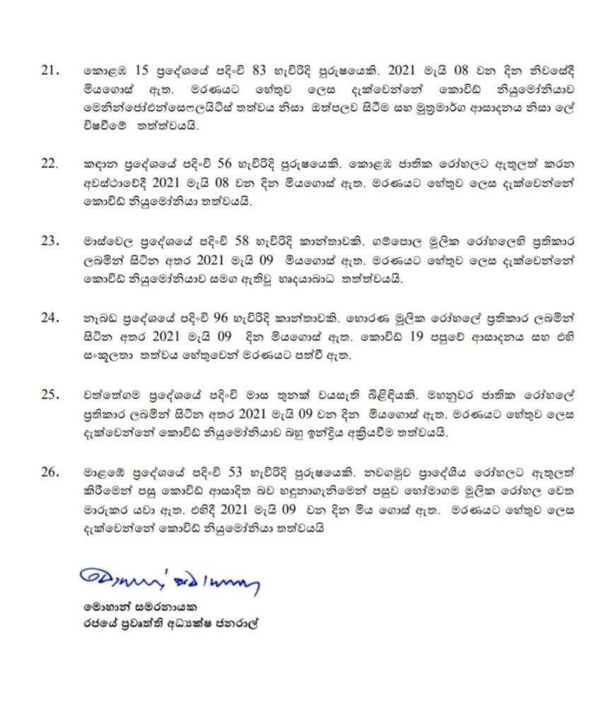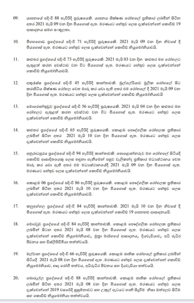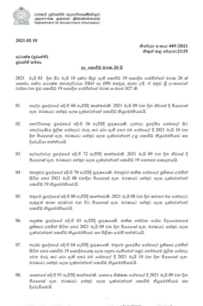 ඉතිරි මරණ 25 වාර්තා වී ඇගාල්ල, හෙට්ටිපොළ, පල්ලේවෙල , මහනුවර, මතුගම, පාදුක්ක, නෑබඩ (මරණ දෙකයි), යාපනය (මරණ දෙකයි), මීගහගොඩ, කළුතර , අකුරැස්ස, මොරොන්තුඩුව, කළුතර, අනුරධපුරය, කොළඹ – 6, කලුඅග්ගල, මොරටුව, මල්වාන, බොරැල්ල, කොළඹ- 15, කඳාන, මාස්වෙල, වත්තේගම, මාලඹේ යන ප්රදේශ වලින් වේ . ඒ අනුව මෙරට සමස්ත කොවිඩ් -19 මරණ සංඛ්යාව 827 ක් දක්වා ඉහළ ගියේ ය.