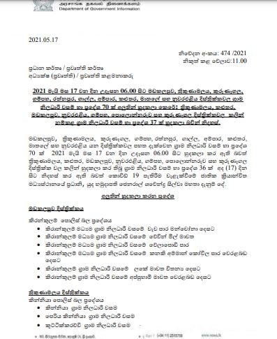 දිවයිනේ දිස්ත්‍රික්ක 10 ක ග්‍රාම නිළධාරී වසම් 70 ක් වහාම ක්‍රියාත්මක වන පරිදි අද (17) උදෑසන සිට හුදකලා ( Lockdown) කර ඇති බව යුද හමුදාපති ජෙනරල් ශවේන්ද්‍ර සිල්වා මහතා ප්‍රකාශ කරයි.