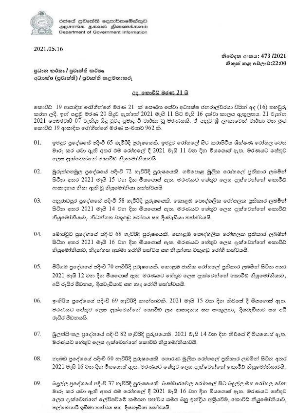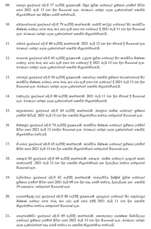 පසුගිය පැය 24 තුළ ශ්‍රී ලංකාව තුළින් ‍කොවිඩ්-19 ආසාදිත වීමෙන් පුද්ගල මරණ 21 ක් වාර්තා වී ඇති අතර එලෙස මියගොස් ඇත්තේ, ඉමදූව, මුරුත්තගමමුල, අනුරාධපුර, මොරටුව, මීරිගම, ඉංගිරිය, බුලත්සිංහල, නෑබඩ, බඳුල්ල, ගෙලිඔය, යාපනය, හඳපාන්ගොඩ, හබරාඳූව, ඇඹිලිපිටිය, නාකියාදෙණිය, ගාල්ල (මරණ දෙකයි), කඩවත, හාලිඇල, මහයියාව, දකුණු කළුතර යන ප්‍රදේශවල පුද්ගයින්ය.