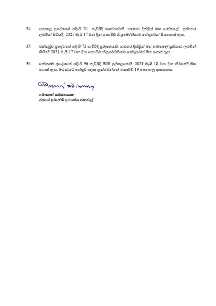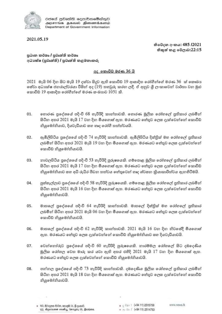 පසුගිය පැය 24 තුළ ශ්රී ලංකාව තුළින් කොවිඩ්-19 ආසාදිත වීමෙන් පුද්ගල මරණ 36 ක් වාර්තා වී ඇති අතර එය දිනක් තුළ මෙරටින් මියගිය වැඩිම කොවිඩ් මරණ සංඛ්යාවයි.