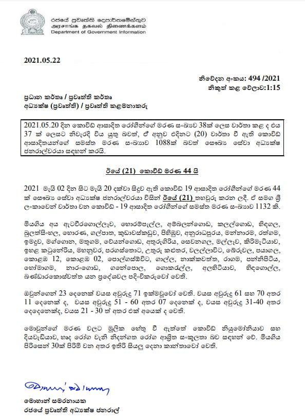 ඒ අනුව මෙරට සමස්ත කොරෝනා මරණ සංඛ්යාව 1132ක් දක්වා ඉහළ යනු ඇත.