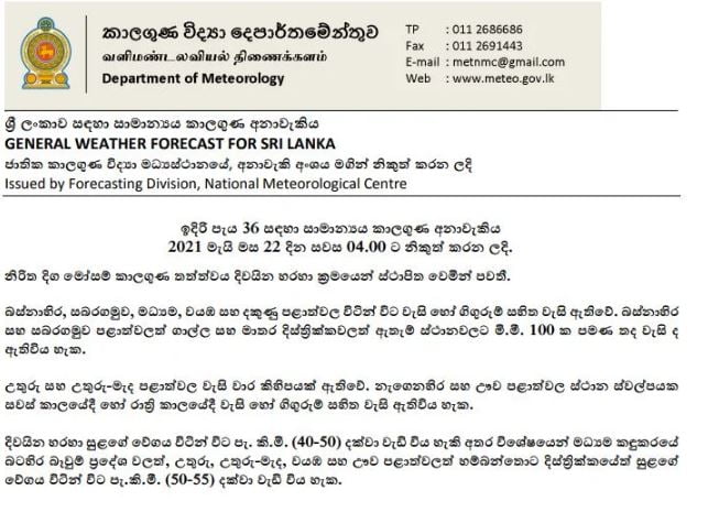 කාලගුණ විද්‍යා දෙපාර්තමේන්තුව වැඩිදුරටත් සඳහන් කරන්නේ,  ඉදිරි දිනයේ දී, නිරිත දිග මෝසම් කාළගුණ තත්ත්වය දිවයින හරහා ක්‍රමයෙන් ස්ථාපිත වෙමින් පවතින බවත්, බස්නාහිර, සබරගමුව පළාත්වලත් ගාල්ල හා මාතර දිස්ත්‍රික්කවලත් ඇතැම් ස්ථානවලට මි.මී. 100 ක පමණ තද වැසි අතිවිය හැකි බවයි.