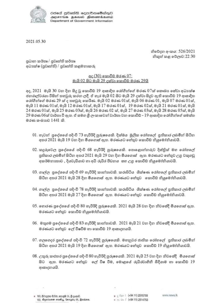 ඒ අනුව මෙරට සමස්ත කොවිඩ් -19 මරණ සංඛ්යාව 1,441 ක් දක්වා ඉහළ ගියේ ය.