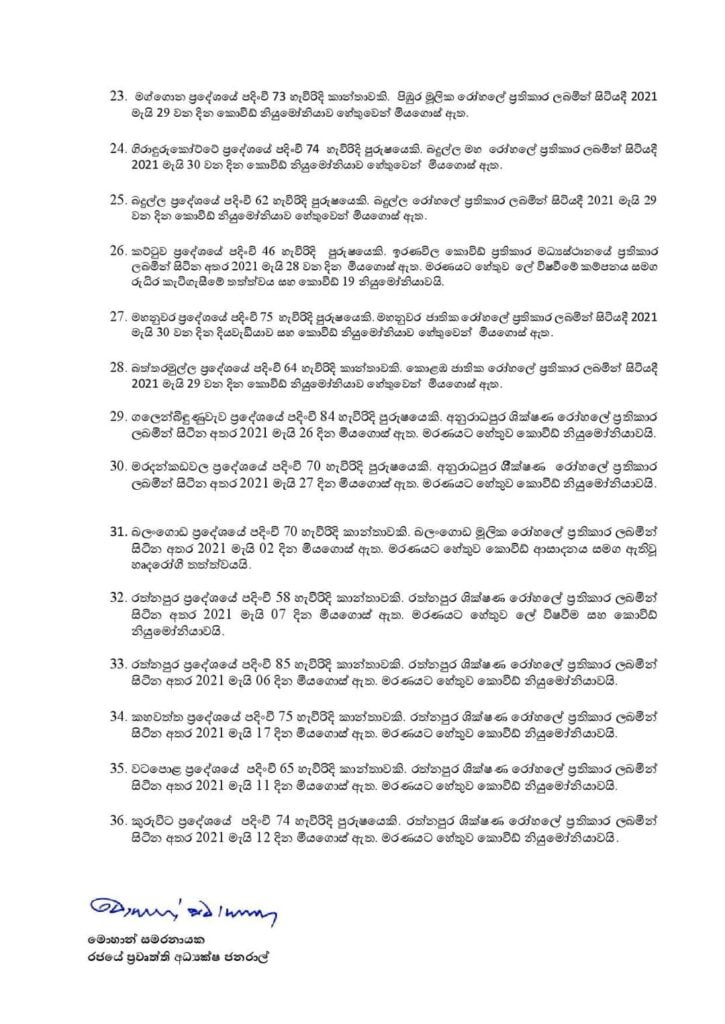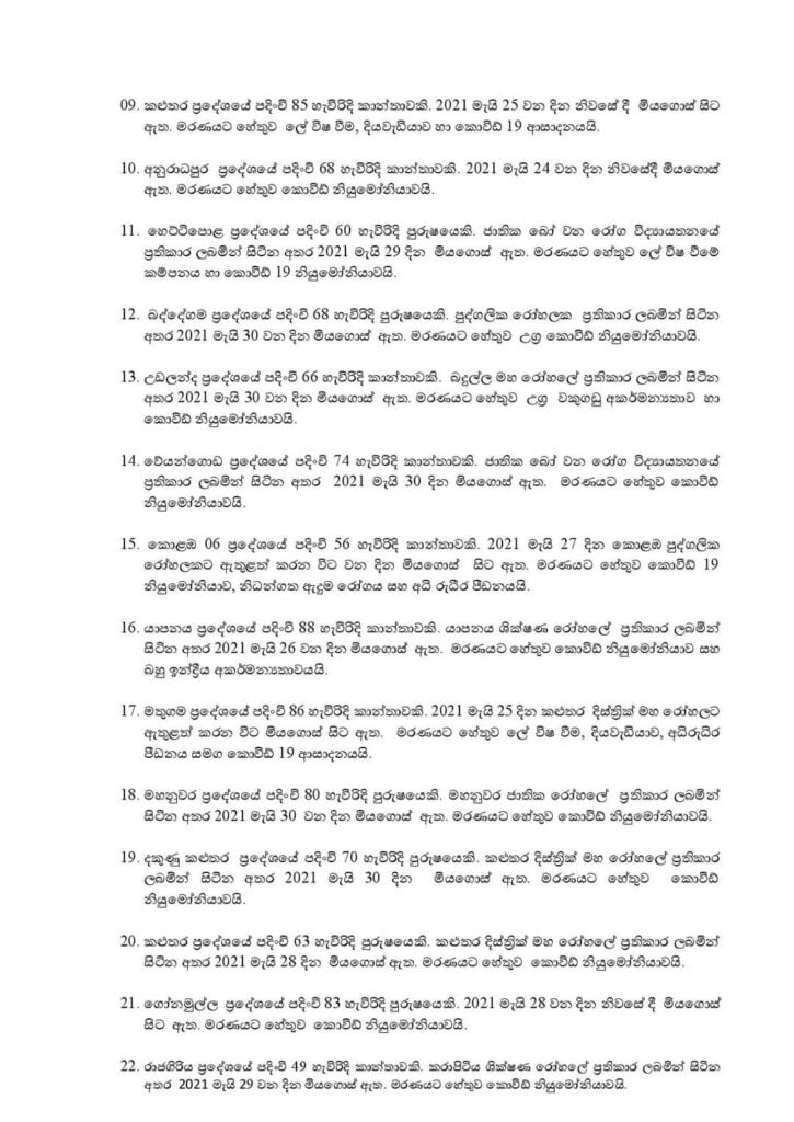 පසුගිය පැය 24 තුළ ශ්රී ලංකාව තුළින් කොවිඩ්-19 ආසාදිත වීමෙන් පුද්ගල මරණ 36 ක් වාර්තා වී ඇති අතර එලෙස මියගොස් ඇත්තේ, හැටන්, කඳුරුවෙළ, ගාල්ල (මරණ 2යි) , හොරණ, මතුගම,ගලගෙදර, කළුතර (මරණ 4), අනුරාධපුර, හෙට්ටිපොළ, බද්දේගම, උඩලන්ද, වේයන්ගොඩ, කොළඹ – 6, යපනය, මතුගම, මහනුවර, ගෝනමුල්ල, මග්ගොන, රාජගිරිය, ගිරාදුරුකෝට්ටේ, බදුල්ල, කට්ටුව, මහනුවර, බත්තරමුල්ල, ගලෙන්බිදුණුවැව, මරදන්කඩවල, බලංගොඩ, රත්නපුර (මරණ 2යි), කහවත්ත, වටපොළ සහ කුරුවිට යන ප්රදේශ වල පුද්ගයින් වේ.