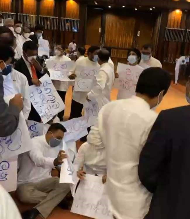 මේ අතර අද (23) උදෑසන පාර්ලිමේන්තුවේ වැඩකටයුතු ආරම්භ වු පසු සමගි ජන බලවේගයේ මන්ත්‍රීවරු පිරිසක් පාර්ලිමේන්තුවේ සභාගර්භය තුළ විරෝධතාවයක් සිදු කර ඇත.