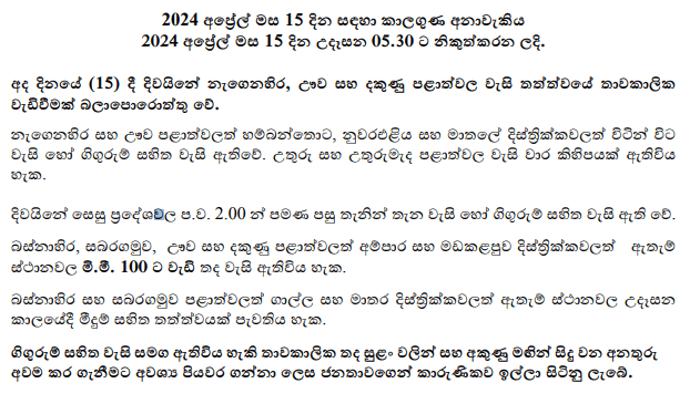 අද (15) දිනයේ ප්රදේශ රැසක වැසි තත්ත්වයේ තාවකාලික වැඩිවීමක් අපේක්ෂා කරන බව කාලගුණ විද්යා දෙපාර්තමේන්තුව පවසයි.