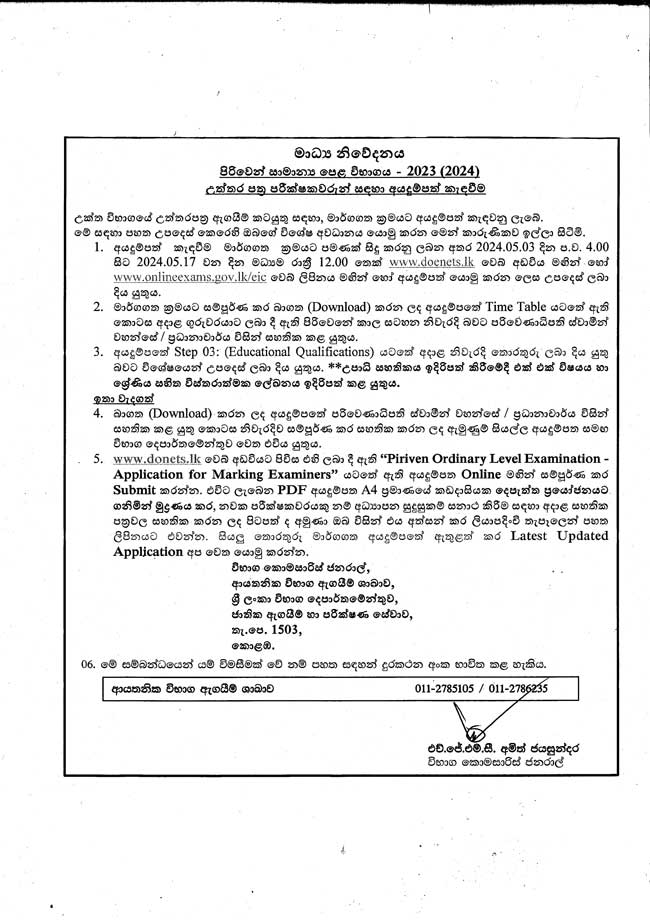 පිරිවෙන් සාමාන්ය පෙළ විභාගය 2023 (2024) උත්තර පත්ර පරීක්ෂකවරුන් සඳහා අයදුම්පත් කැඳවීම මාර්ගගත ක්රමයට සිදුකෙරෙන බව විභාග දෙපාර්තමේන්තුව දැනුම්දෙයි.