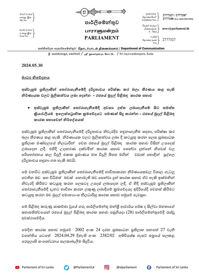 එමෙන්ම අස්වැසුම ප්රතිලාභීන් තෝරාගැනීමේදී අවශ්ය දත්ත ලබාගැනීමේ සිට සමස්ත ක්රියාවලියම ඉලෙක්ට්රෝනික ක්රමවේදයට පමණක් සිදුකරන ලෙසටද එම කාරක සභාව නිර්දේශය කර තිබේ.