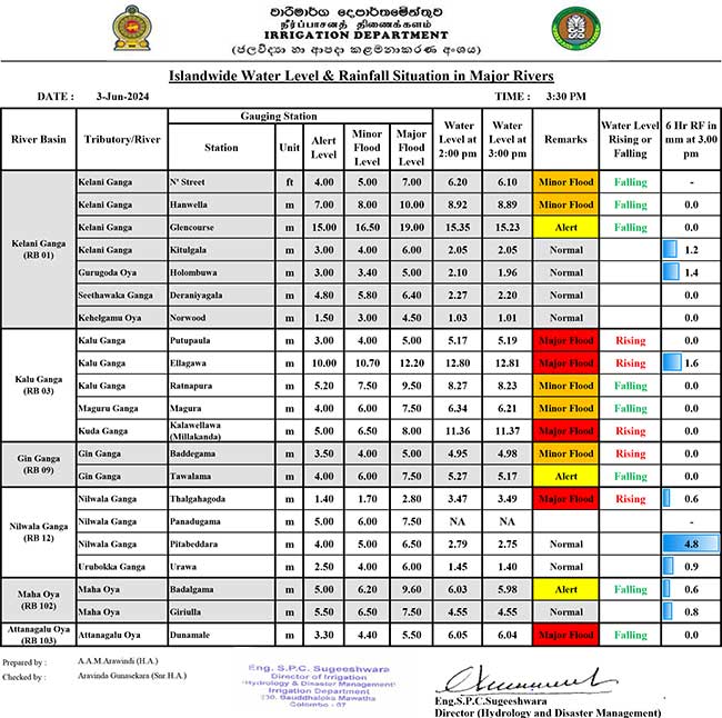 අද පස්වරු 3.30ට වාරිමාර්ග දෙපාර්තමේන්තුව නිකුත් කළ කැලණි, කළු, ගිං, නිල්වලා, මහඔය. අත්තනගලු ඔය ආශ්රිත ගංවතුර තත්ත්වයේ නවතම නිවේදනය පහතින්.