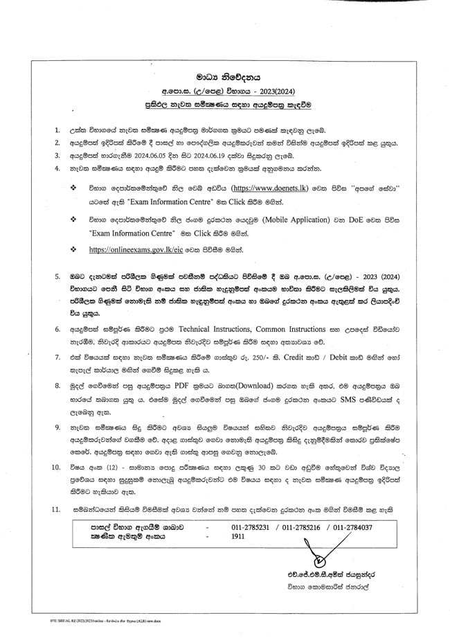2023 (2024) අපොස උසස් පෙළ විභාගයේ ප්රතිඵල නැවත සමීක්ෂණය සඳහා අයදුම්පත් කැඳවීම අදින් ආරම්භ වන බව විභාග දෙපාර්තමේන්තුව නිවේදනය කරයි.