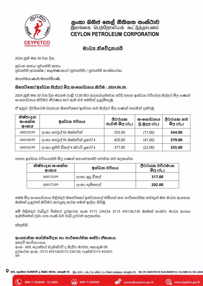 ColomboBuzzfeatureNewsHot NewsLocalඉන්ධන මිල වෙනස් වෙයි sp2 years ago2 years ago01 mins අද (30) මධ්යම රාත්රියේ සිට ක්රියාත්මක වන පරිදි සිපෙට්කෝ ඉන්ධන මිල ගණන් සංශෝධනය කර තිබේ.Share this:TwitterFacebookWhatsAppLike this:Like Loading...Post navigationPrevious: අවසන් මහා තරගයේ පළමු වාසිය ඉන්දියාවටNext: බස් ගාස්තු වෙනසට කුමක් වෙයිද ?Leave a Reply Cancel replyYour email address will not be published. Required fields are marked *Comment *Name * Email * Website Save my name, email, and website in this browser for the next time I comment. Δ