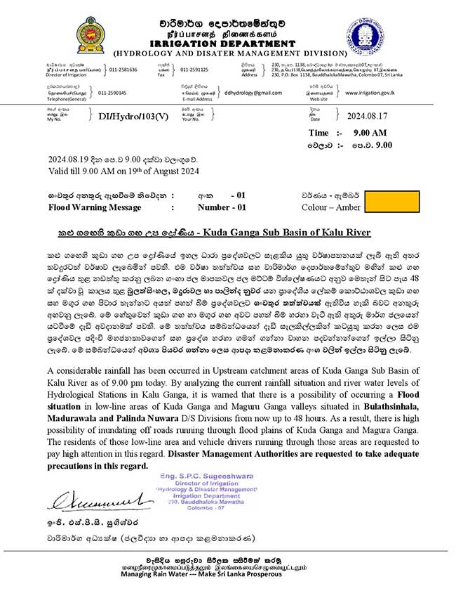 ඒ අනුව වාරිමාර්ග දෙපාර්තමේන්තුව මඟින් කළු ගඟ ද්රෝණිය තුළ නඩත්තු කරනු ලබන ගංඟා ජල මාපකවලට අනුව අද පෙ.ව. 9.00 සිට ඉදිරි පැය 48ක් දක්වා වූ කාලය තුළ ප්රාදේශීය ලේකම් කොට්ඨාස තුනකට අනතුරු ඇඟවීම් නිකුත් කර ඇත.