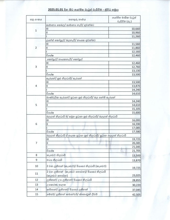 සැරයන් / සුළු නිලධාරී / සැරයන් යන තනතුරුවල III ශ්රේණියේ වැටුප රුපියල් 13,500කින්, II ශ්රේණිය සඳහා රුපියල් 13,870ක් හා I ශ්රේණිය සඳහා රුපියල් 14,240කින් වැටුප් වැඩිවීම සිදුවෙයි. එම සේවයේ විශේෂ ශ්රේණියේ මූලික වැටුප රුපියල් 14,610කින් ඉහළ නැංවෙනු ඇත.