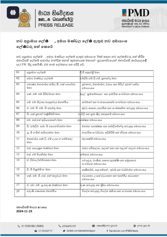 නව අග්රාමාත්ය ලේකම්, අමාත්ය මණ්ඩල ලේකම් ඇතුළු අමාත්යංශ 16ක් සඳහා නව ලේකම්වරුන් පත්කර තිබේ.