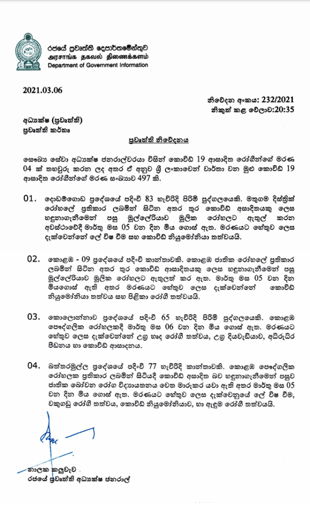 පසුගිය පැය 24 තුළ ශ්‍රී ලංකාව තුළින් ‍කොවිඩ්-19 ආසාදිත වීමෙන් පුද්ගල මරණ 04 ක් වාර්තා වී ඇති අතර මෙලෙස මිය ගොස් ඇත්තේ, දොඩම්ගොඩ ප්‍රදේශයේ පදිංචිව සිටි 83 හැවිරිදි පිරිමි පුද්ගලයෙක්, කොළඹ 09 ප්‍රදේශයේ පදිංචිව සිටි කාන්තාවක්, කොලොන්නාව ප්‍රදේශයේ පදිංචිව සිටි 65 හැවිරිදි පිරිමි පුද්ගලයෙක් සහ බත්තරමුල්ල ප්‍රදේශයේ පදිංචිව සිටි 77 හැවිරිදි කාන්තාවක් වේ. ඒ අනුව මෙරට සමස්ත කොවිඩ් -19 මරණ සංඛ්‍යාව 497 දක්වා ඉහල ගොස් ඇත.