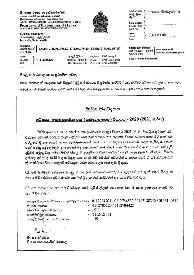 මෙහිදී විභාගය අවසන්වීමෙන් පසුව සිසුන්ට සාමකාමීව විසිර යන ලෙස විභාග දෙපාර්තමේන්තුව නිවේදනයක් නිකුත් කරමින් දැනුම්දෙන අතර විභාග දෙපාර්තමේන්තුව සඳහන් කරන්නේ විභාගය අවසන්වීමෙන් පසුව විභාග මධ්යස්ථානවලදී හෝ එම පරිශ්ර තුළදී කළහකාරී ලෙස හැසිරුණහොත් හෝ අනෙක් සිසුන්ට බාධාකාරී ලෙස හැසිරුණහොත් හෝ පොදු දේපළවලට අලාභහානි සිදු කළහොත් විභාග පනත යටතේ දැඩි දඬුවම් පමුණුවන බවයි.