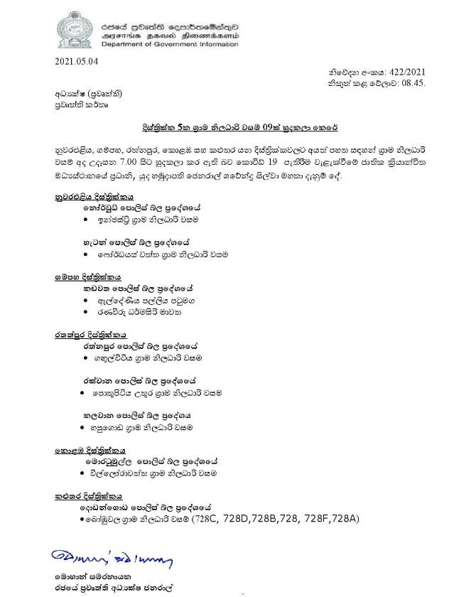 දිවයිනේ දිස්ත්රික්ක 5ක ග්රාම නිළධාරී වසම් 9 ක් අද (04) උදෑසන සිට හුදකලා ( Lockdown) කර ඇති බව යුද හමුදාපති ජෙනරල් ශවේන්ද්ර සිල්වා මහතා ප්රකාශ කරයි.